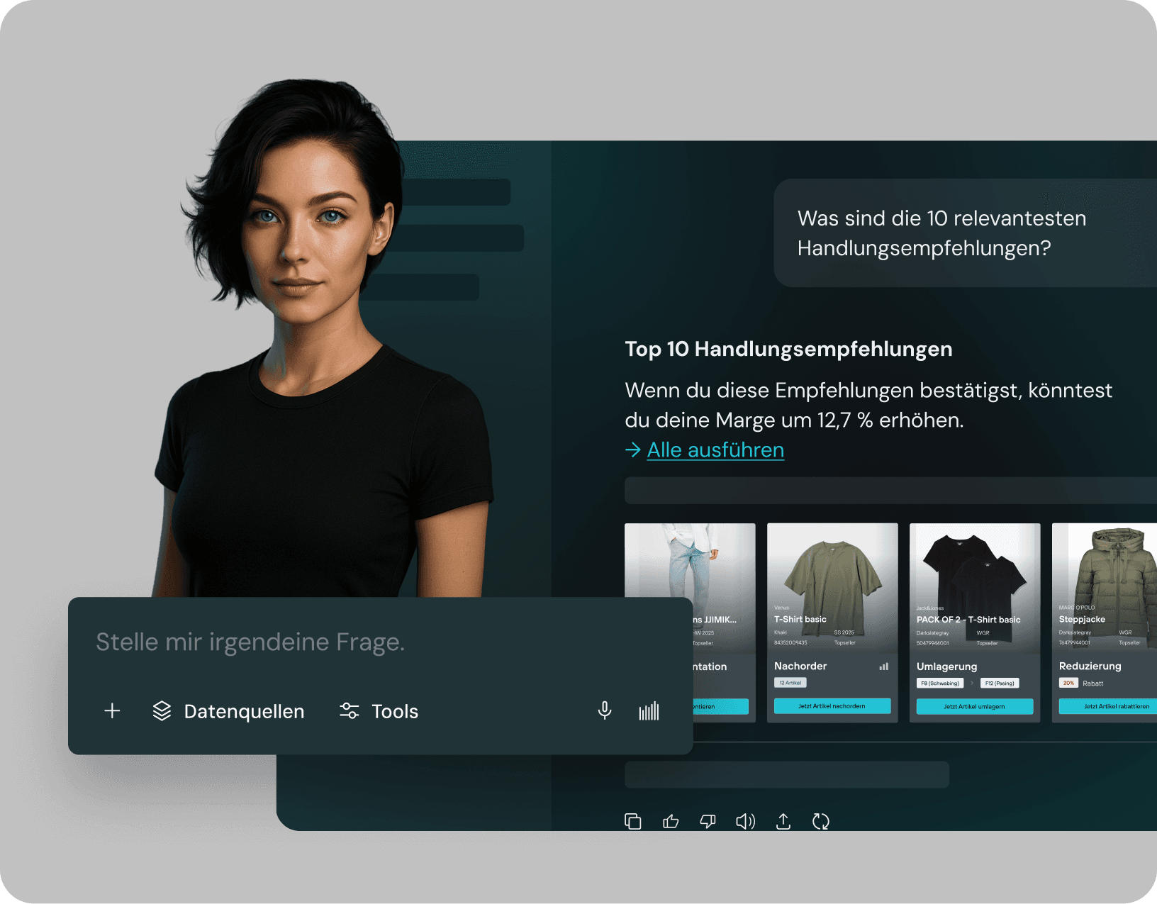 AIVEE übersetzt Analysen und Prognosen in konkrete Handlungsempfehlungen – Umlagerung, Reduzierung, Nachorder, Mitarbeiterprämien und Warenpräsentation. Diese können bestätigt, angepasst, verworfen oder mit der KI diskutiert werden.